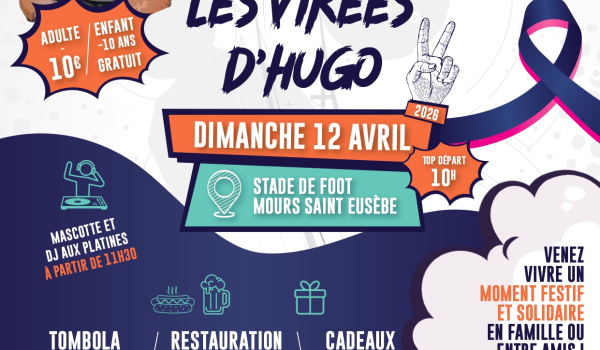 Les virées d'Hugo - 2ème édition !! marchons ensemble pour la bonne cause, dimanche 12 avril 2026 au départ du stade de foot de Mours Saint Eusèbe, à partir de 10h. 3 Parcours : 2.5 km, 5 km, 8 km.